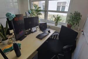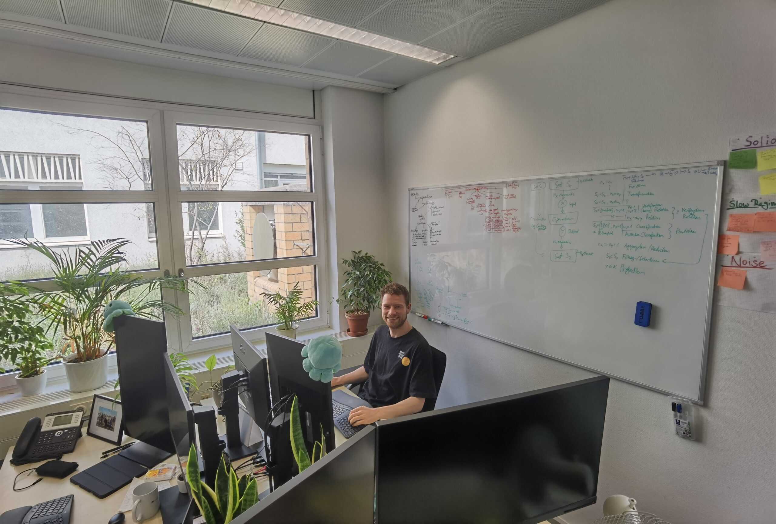 - Wenn ich im Büro bin arbeite ich oft am Computer, male auf meinem Whiteboard hinter mir oder rede mit meinen Kollegen über Probleme